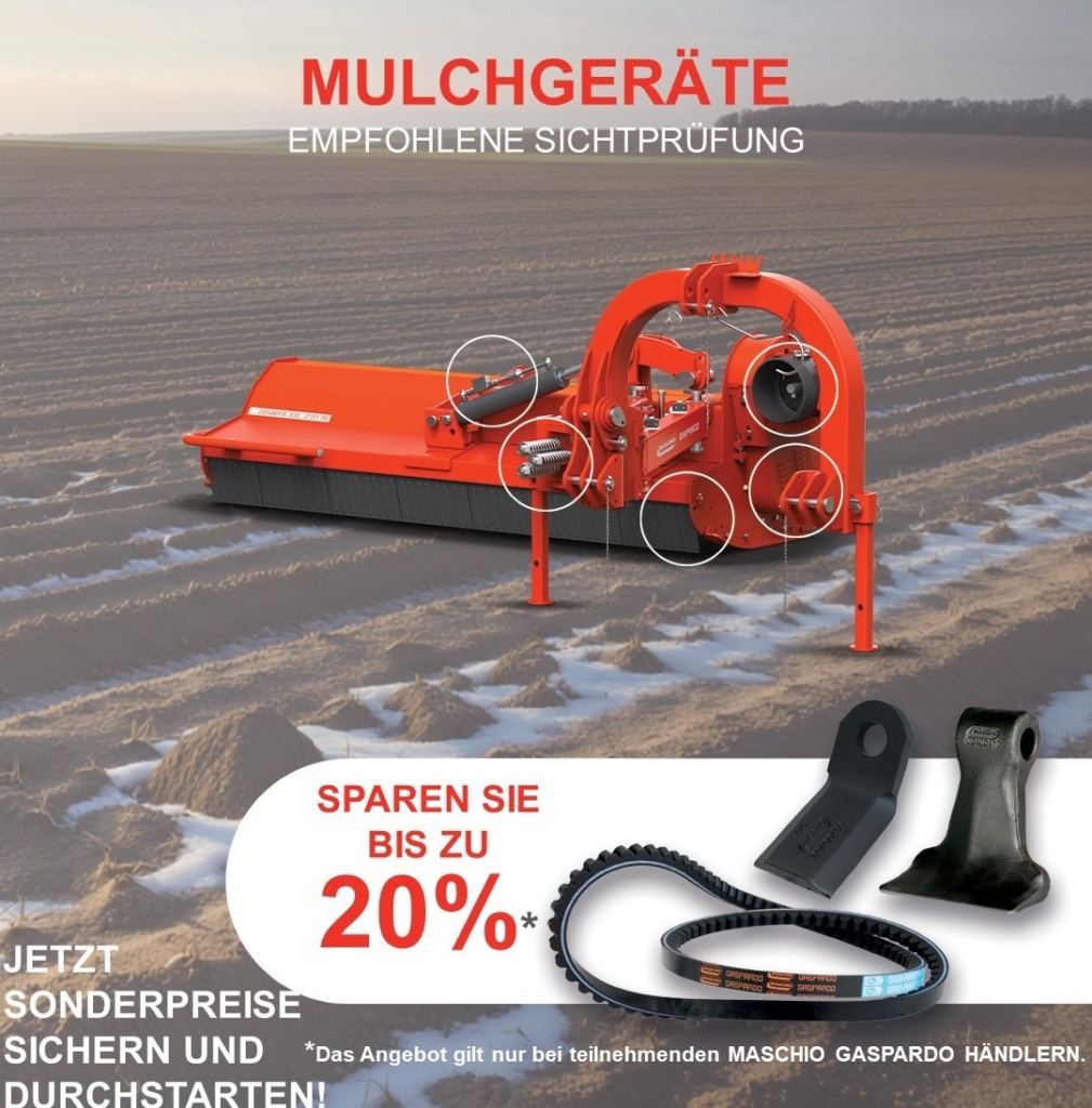 Die neue Saison beginnt mit der richtigen Vorbereitung. Nutzen Sie jetzt die Frühbezugsaktion von Maschio Gaspardo und machen Sie Ihre Maschinen rechtzeitig einsatzbereit. Vom 19. Januar bis 28. Februar 2026 profitieren Sie von bis zu 20 % Rabatt auf alle Maschio-Gaspardo-Ersatzteile.
